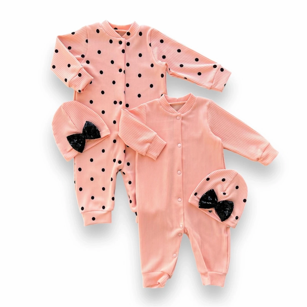 0-3 3-6 6-9 Ay Payetli Şapka Çıtçıt Kapamalı Puantiyeli Ve Düz 2 Li Kombin Kız Bebek Tulumları