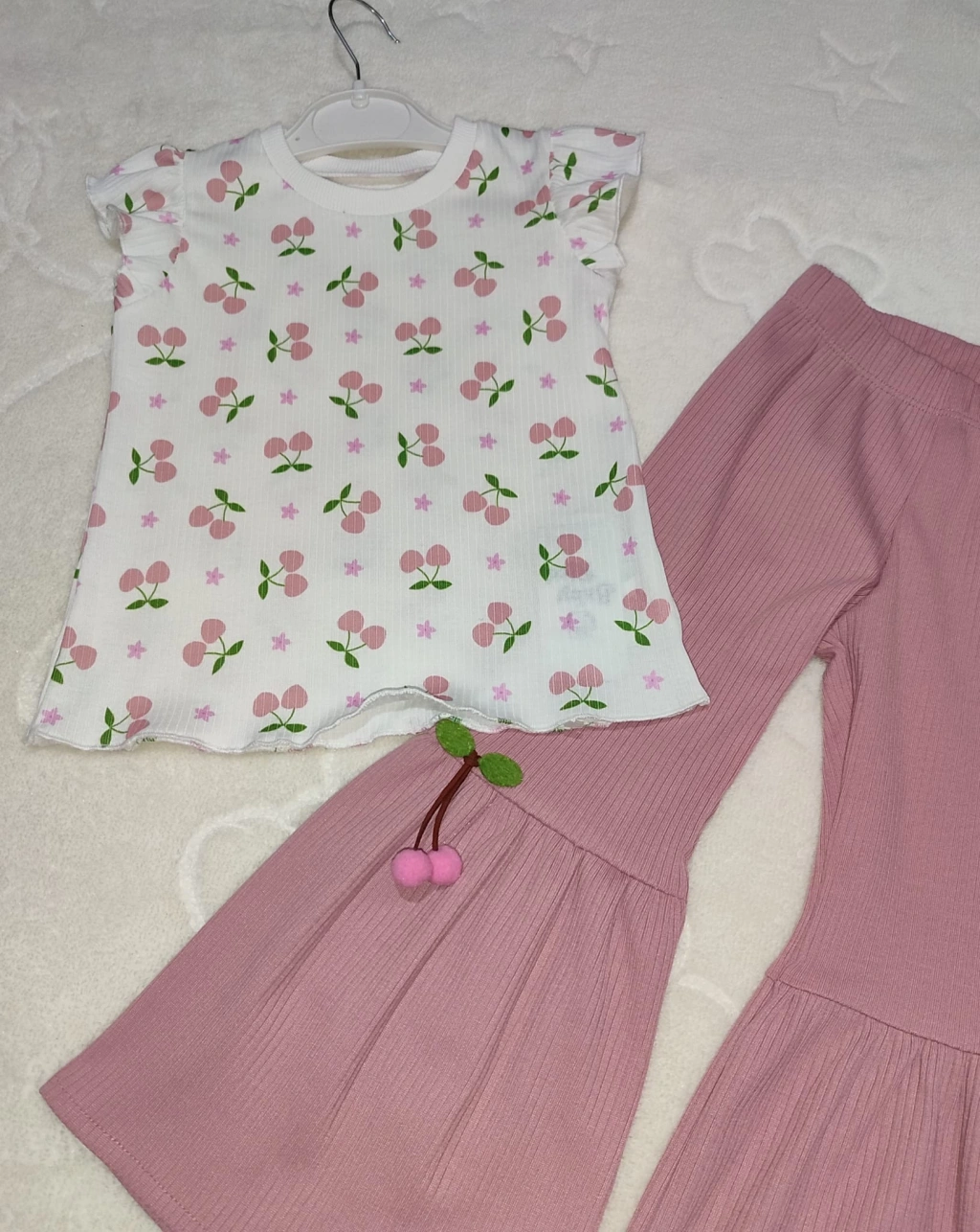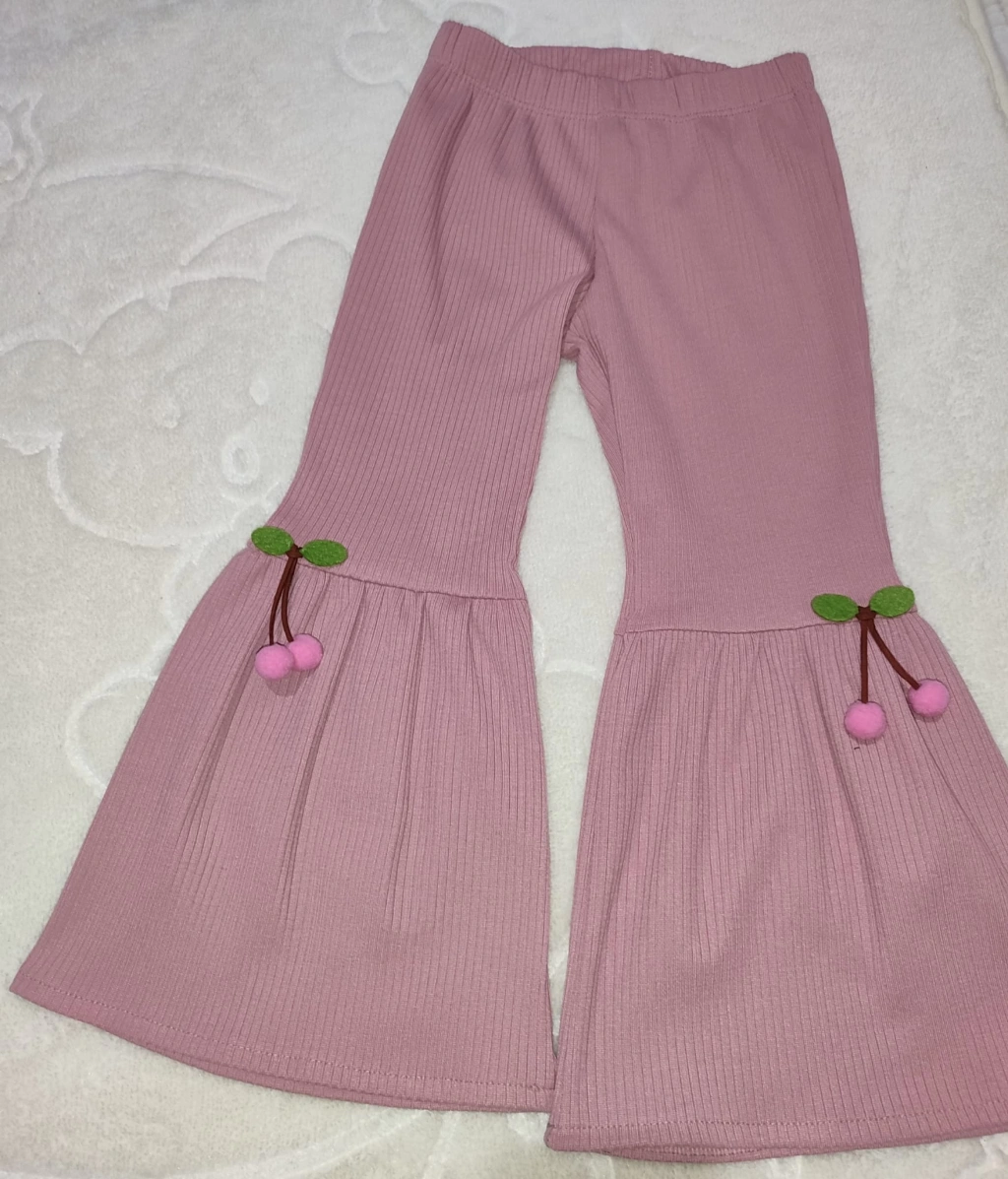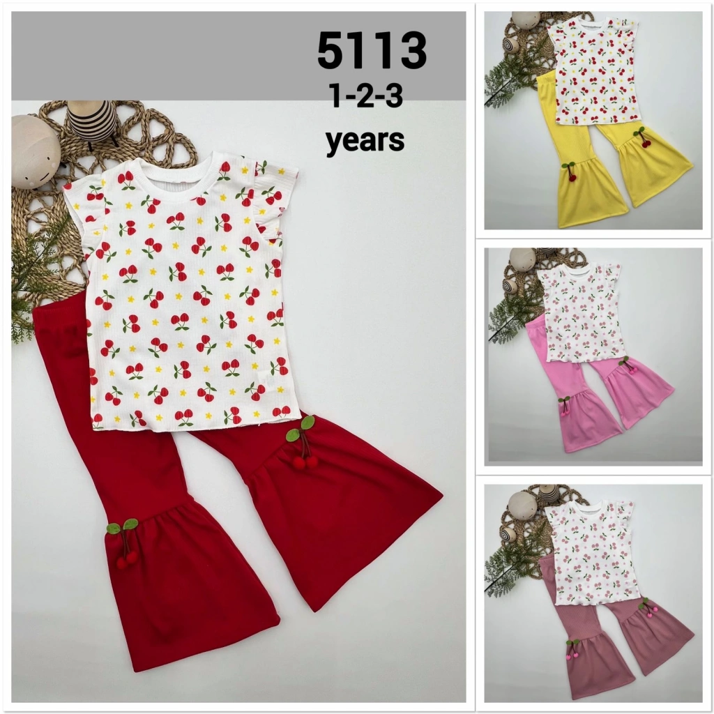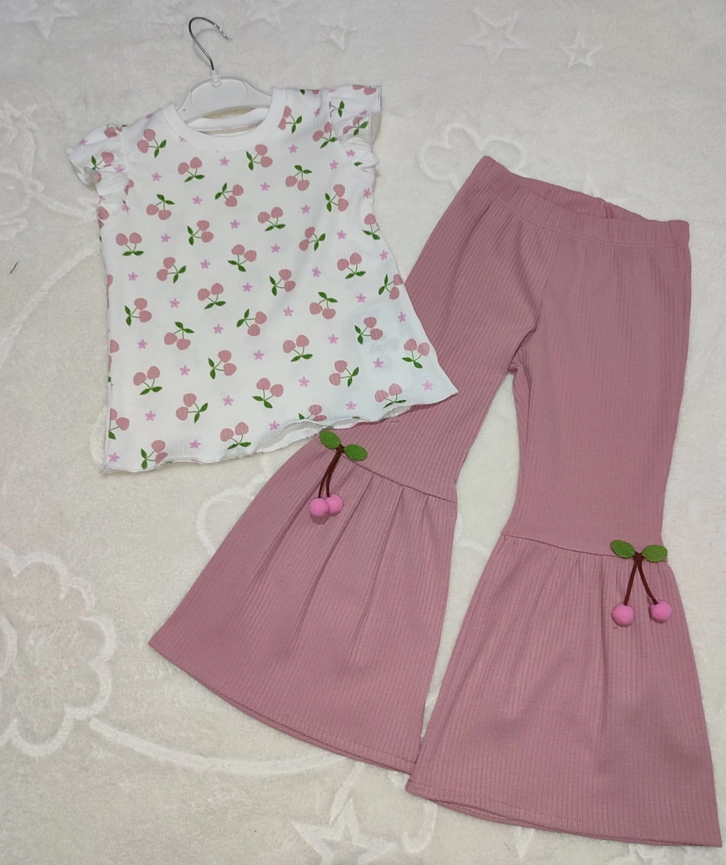 1-2-3-4 Yaş Kiraz Baskılı Tişört İspanyol Paçalı Likralı 2li Kız Çocuk Takımı