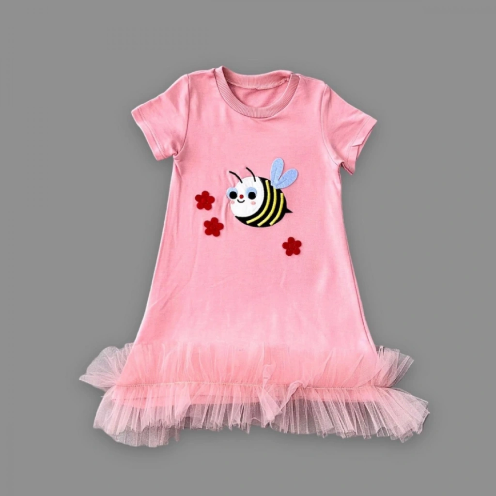 1-2-3 Yaş Arıcık Nakışlı Eteği Fırfırlı Jile Kız Çocuk Elbisesi