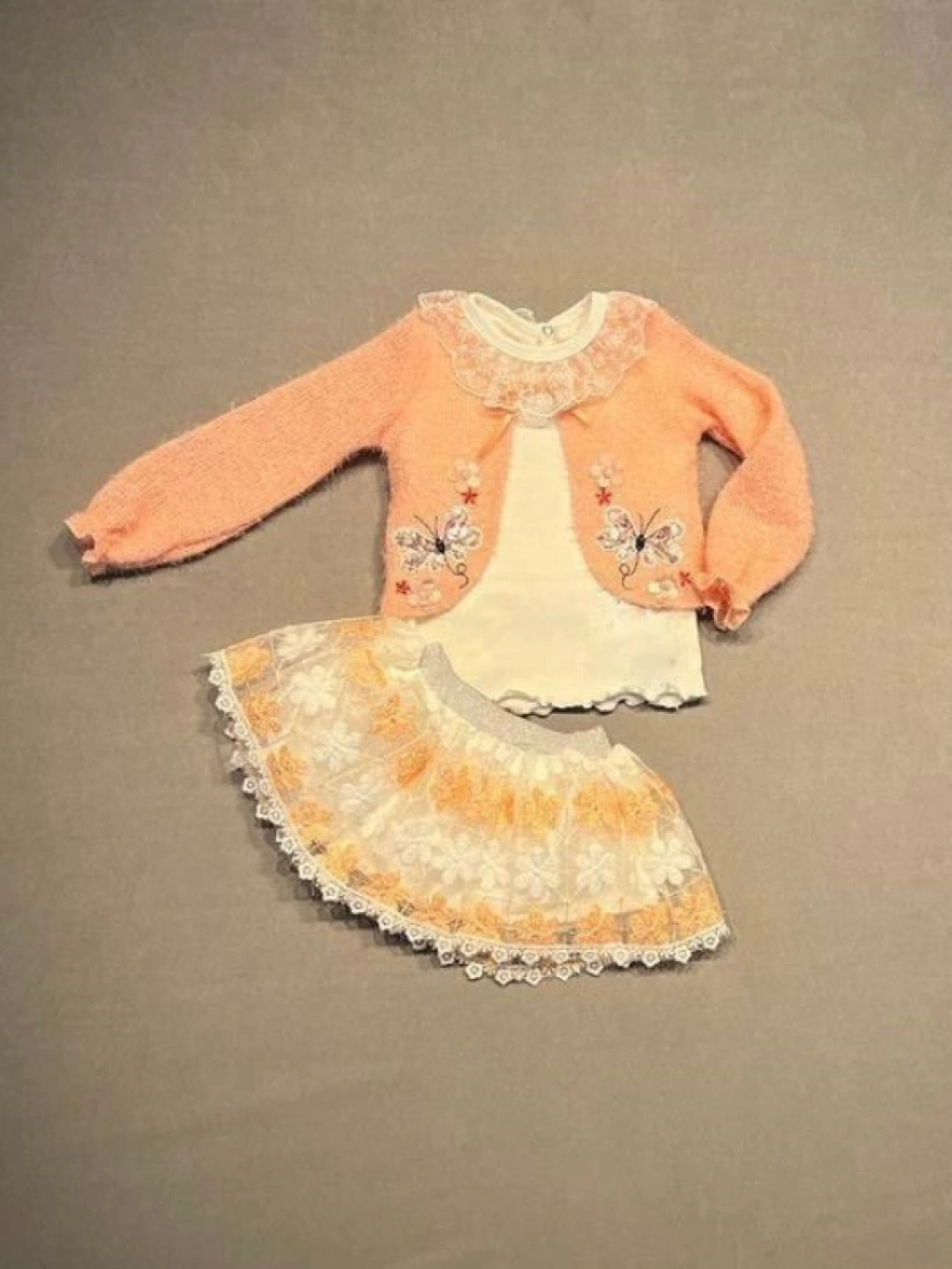 1-2-3 Yaş Brode Etekli Örme Hırkalı Uzun Kollu Sweat 3lü Kız Çocuk Takımı