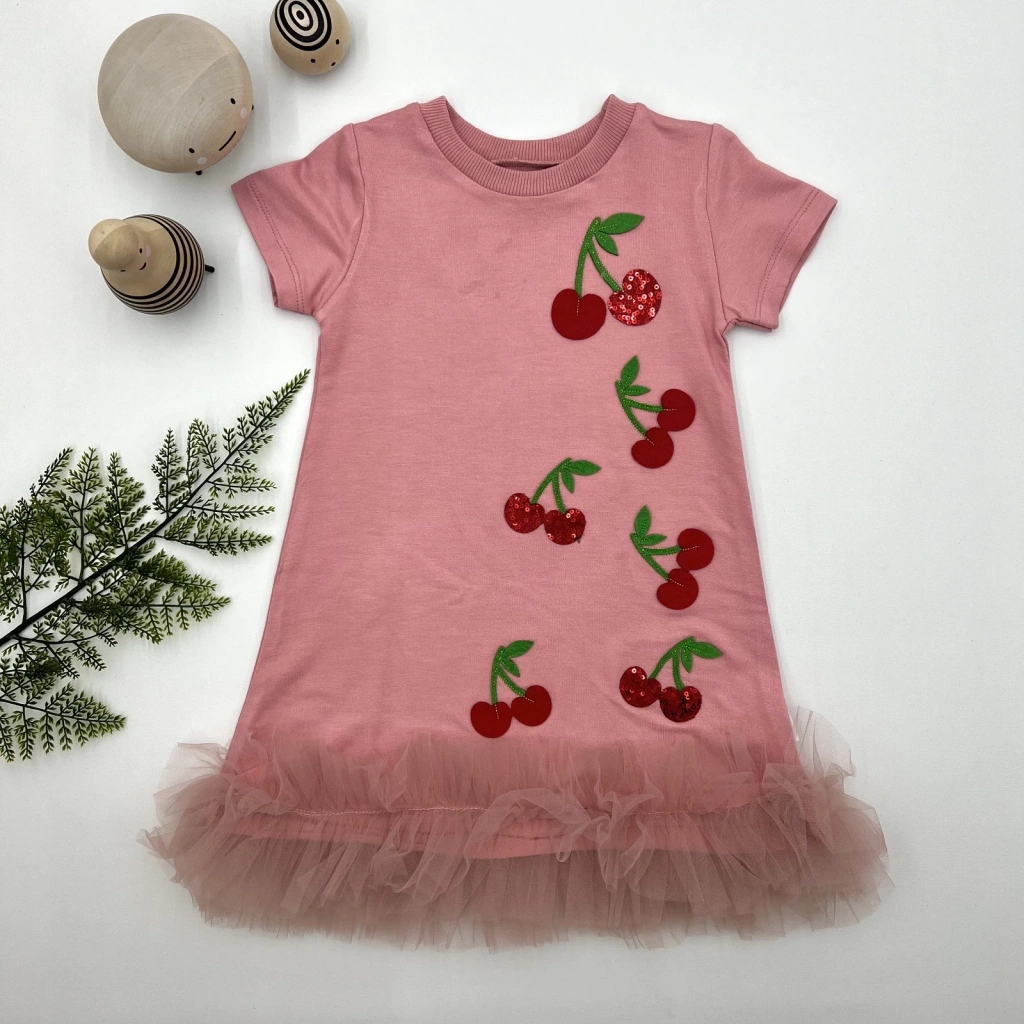 1-2-3 Yaş Payetli Kiraz Nakışlı Eteği Fırfırlı Jile Kız Çocuk Elbisesi