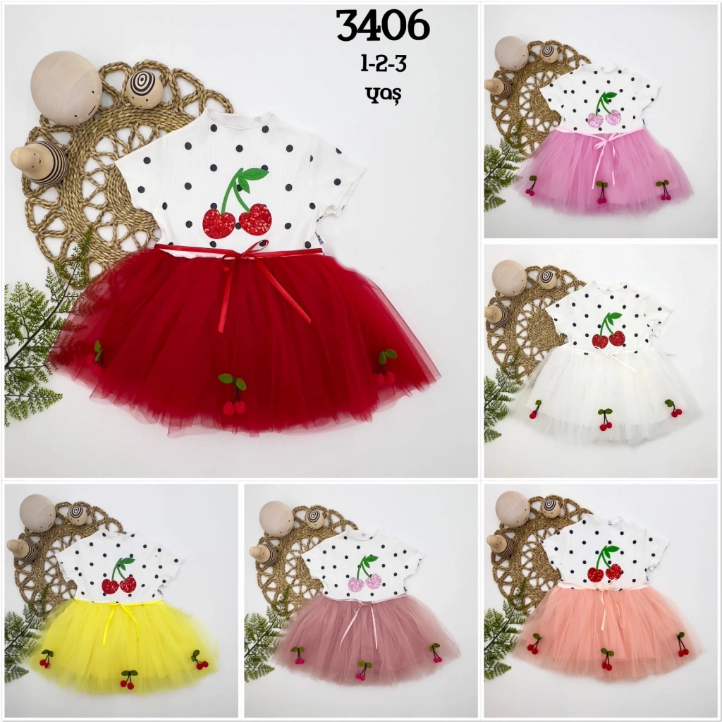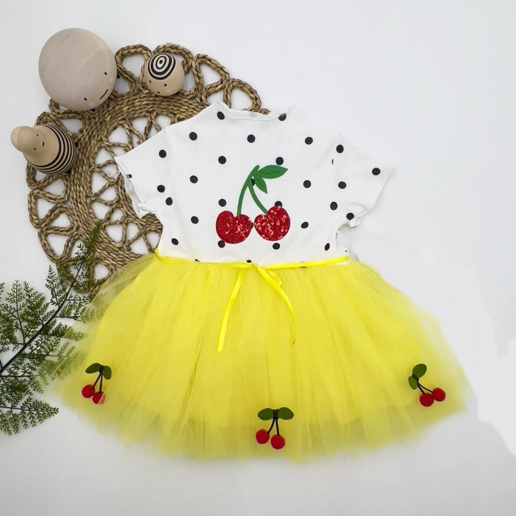 1-2-3 Yaş Payetli Kiraz Nakışlı Kiraz Etekli Kız Bebek Tütü Elbisesi