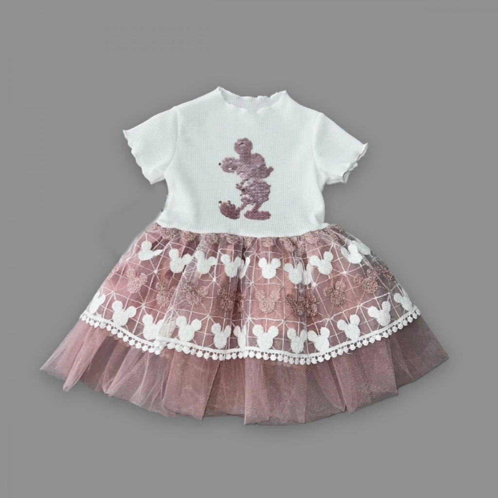 1-2-3 Yaş Payetli Baskılı Brode Etekli Kız Bebek Elbisesi