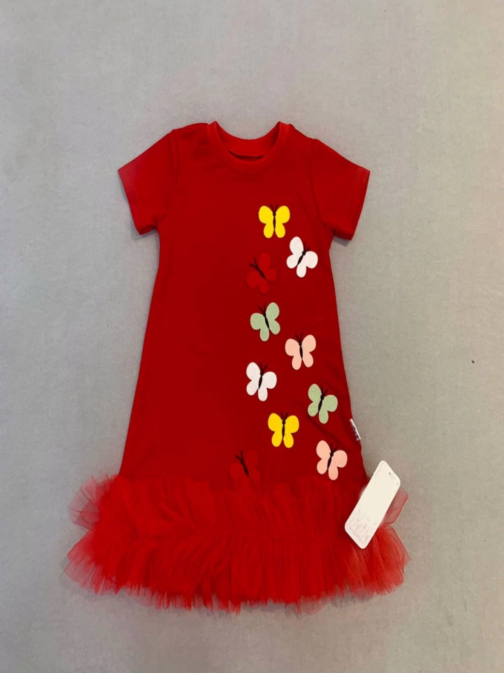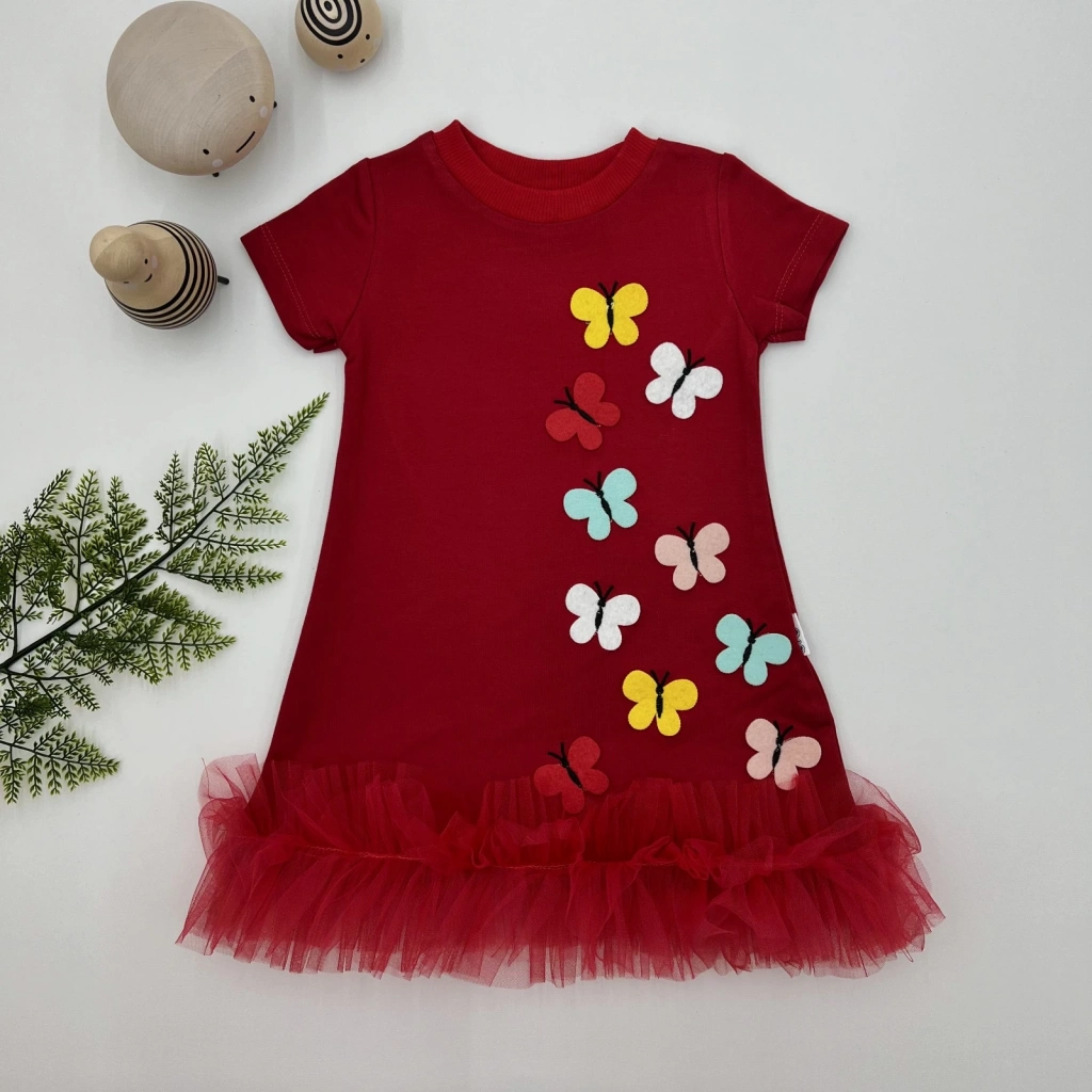1-2-3 Yaş Renkli Kelebekler Nakışlı Eteği Fırfırlı Jile Çocuk Elbisesi