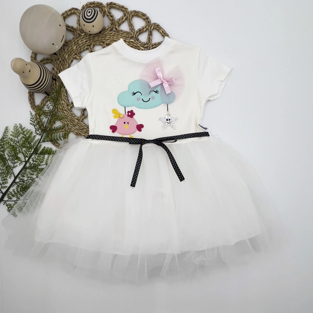 1-2-3 Yaş Tül Tokalı Bulut Civciv Ve Yıldız Nakışlı Kız Bebek Elbisesi