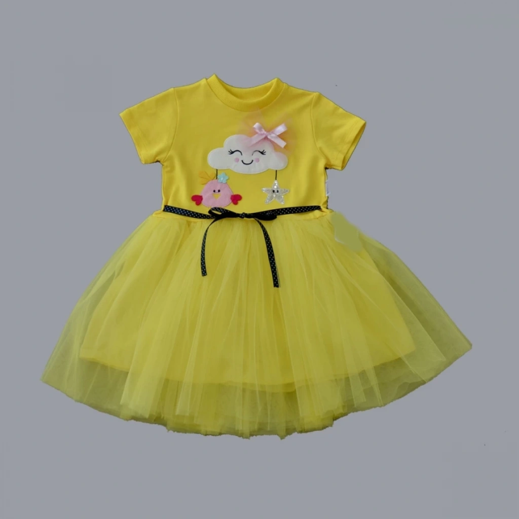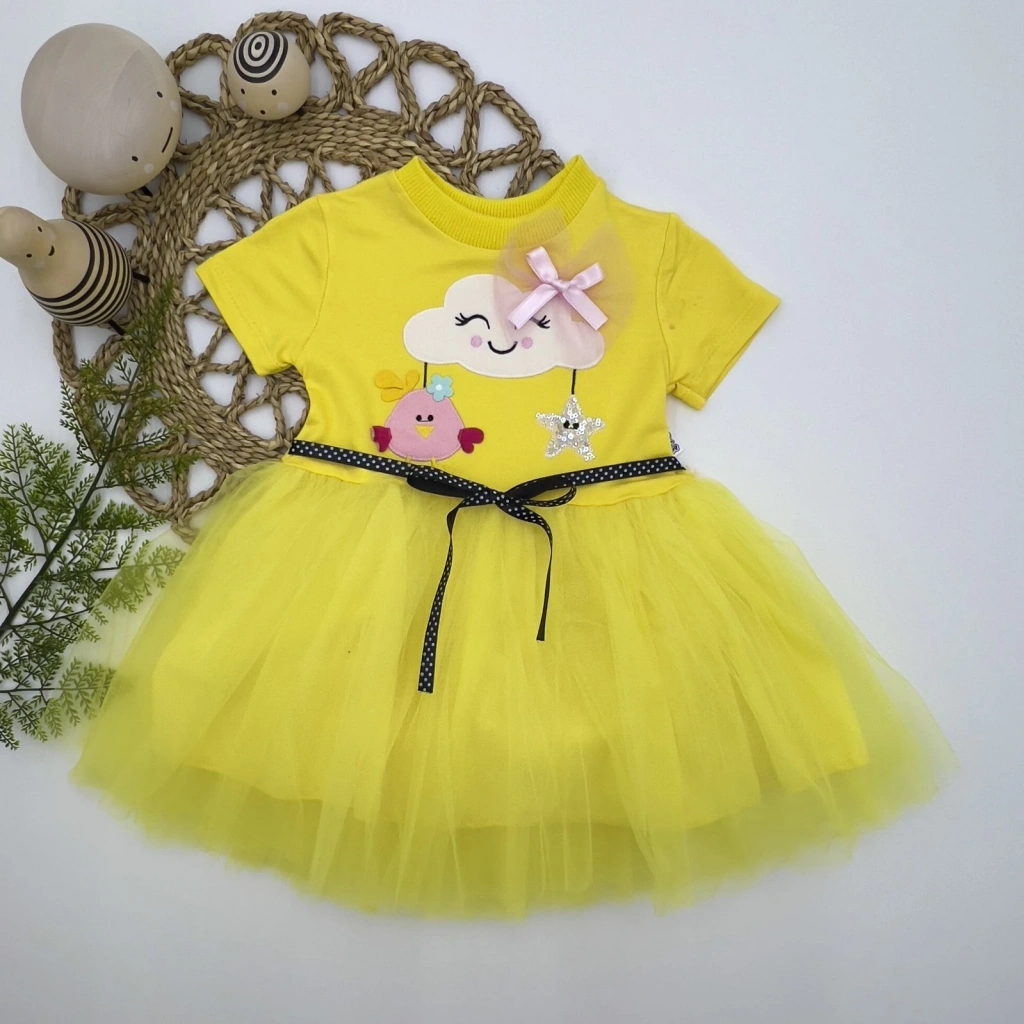 1-2-3 Yaş Tül Tokalı Bulut Civciv Ve Yıldız Nakışlı Kız Bebek Elbisesi