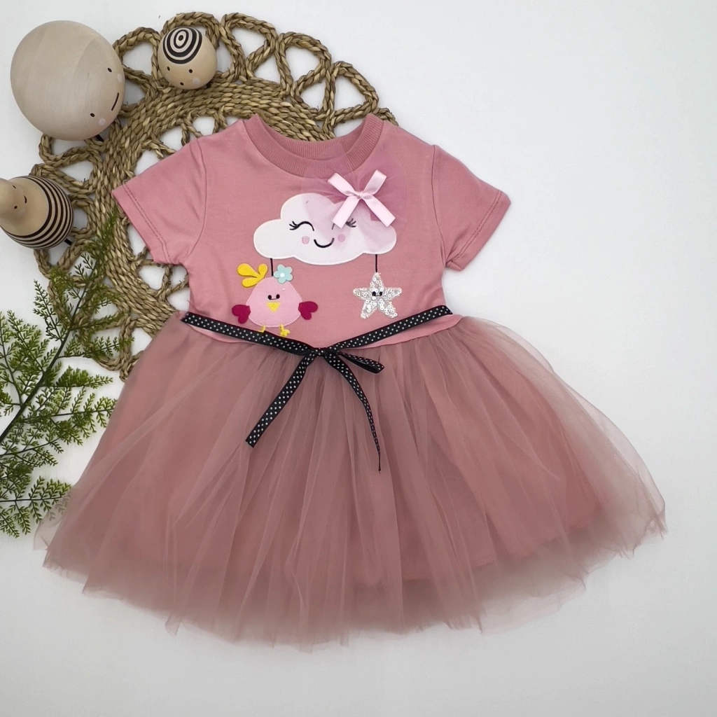 1-2-3 Yaş Tül Tokalı Bulut Civciv Ve Yıldız Nakışlı Kız Bebek Elbisesi