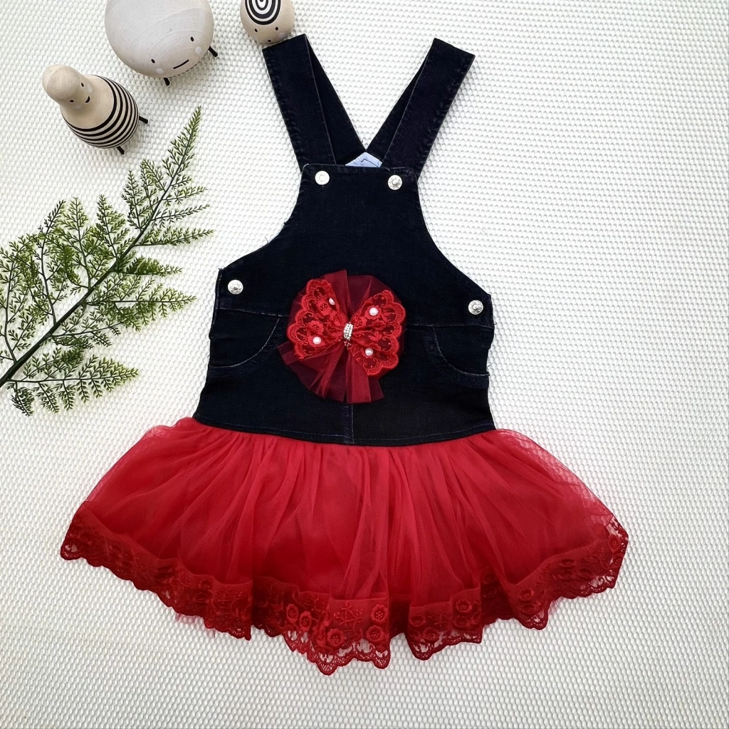 2-3-4 Yaş Fiyonklu Düğme Detaylı Tül Etek Kot Kumaş Salopet Kız Çocuk Elbisesi