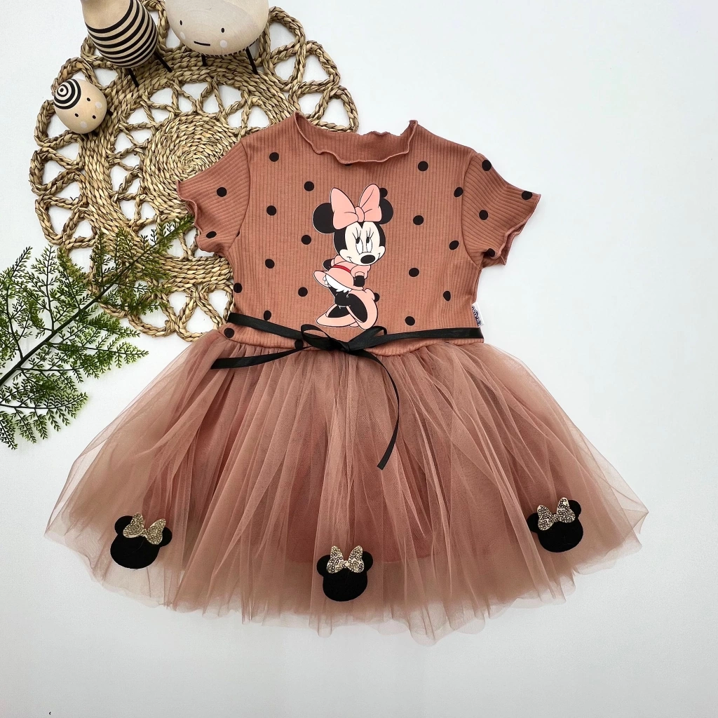 2-3-4 Yaş Puantiyeli Mickey Baskılı Kurdela Kuşaklı Astarlı Kız Bebek Tütü Elbisesi
