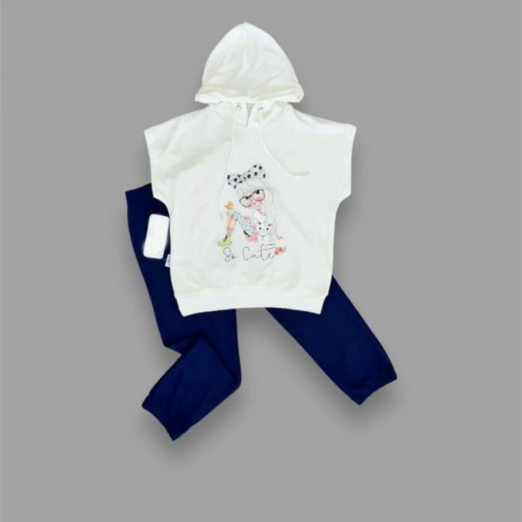 3-4-5 Yaş Kapşonlu Sevimli Kız Baskılı Kısa Kolu 2li Kız Erkek Çocuk Takımı