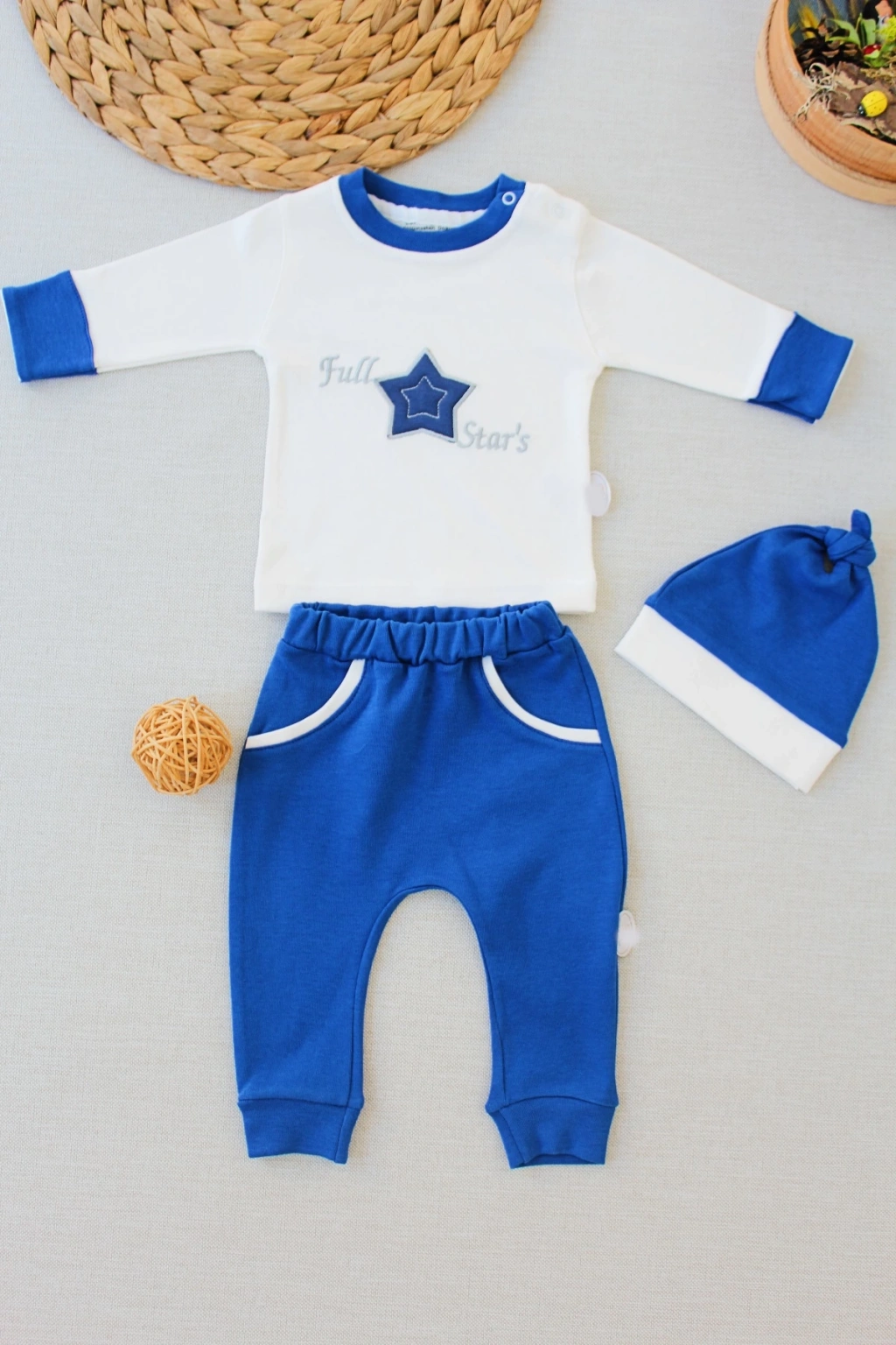 3-6 6-9 9-12 Ay Full Star Nakışlı Şapkalı Uzun Kollu Sweat 3lü Erkek Bebek Takımı