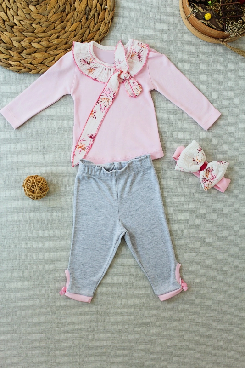 3-6 6-9 9-12 Ay Matmazel Yaka Fırfır Detaylı Bandanalı Uzun Kollu Sweat 3lü Kız Bebek Takımı