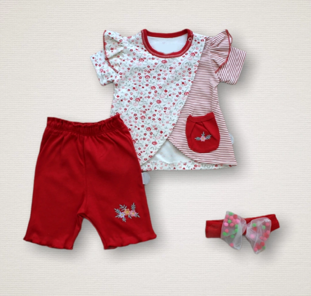 3-6 6-9 9-12 Ay Melek Kız Nakışlı Bandanalı Kısa Kollu Sweatli Şortlu 3lü Kız Bebek Takımı