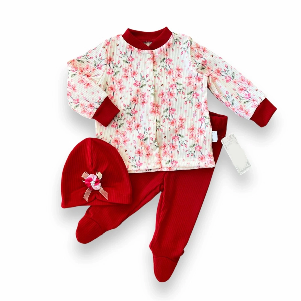 3-6-9-12 Ay Çiçek Baskılı Şapkalı Çıtçıt Kapamalı Patikli 3lü Kız Bebek Takımı