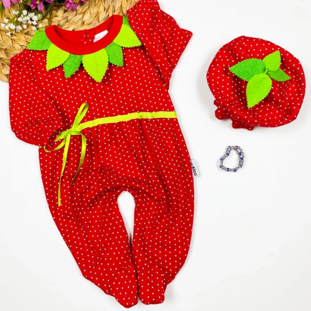 3-6-9 Ay Çilek Bebekler Penye Kumaş Şapkalı Bileklik Hediyeli Uzun Kollu Kız Erkek Bebek Tulumu