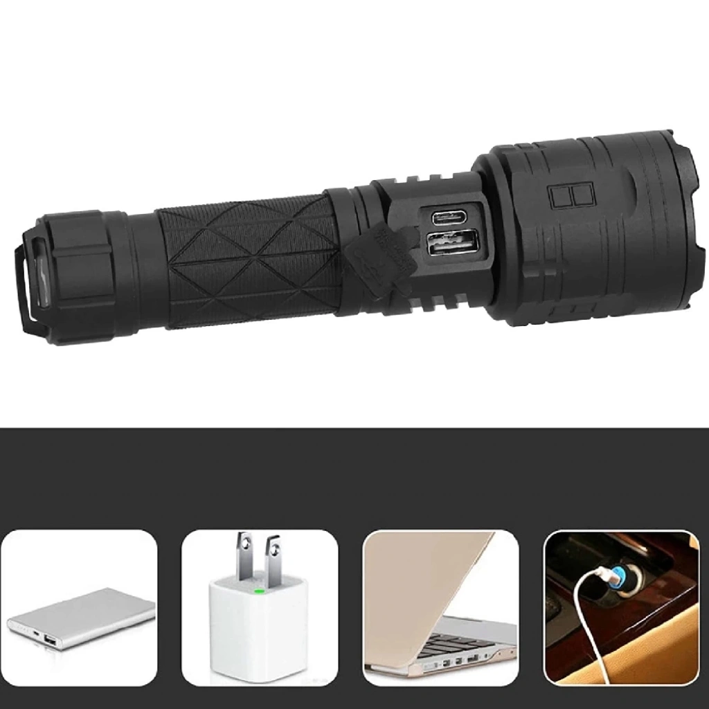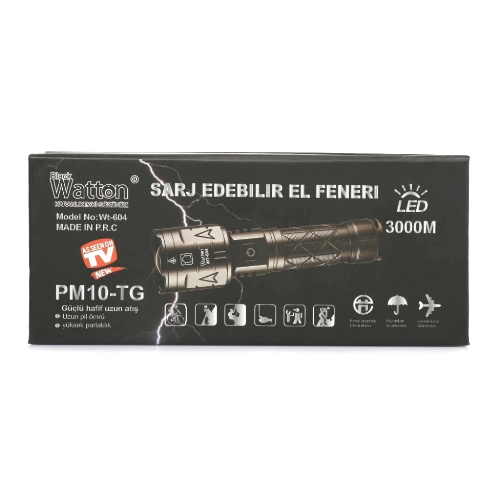 Işık Mesafesi            :200/750 mt Işık Rengi                 :Beyaz ( Gün ışığı ) Çalışma Süresi         :2-4-6-12 Saat Gövde Malzemesi    :Alüminyum Metal Kullanım Şekli          :5 Modda Aydınlatma Yüksek ,Orta,Düşük 2 modda sellektör Kullanım Özellikleri :Elde Kullanım Teknik Özellikleri     :Şarj Edilebilir Pil 220/240 Watt 50/60 Hz ( 26650 8800mAh 4.2v ) ( type c ile Dolum ) Usb Çıkış Powerbank Olarak Kullanım Kutu İçeriği              :Ürün,Usb Şarj Kablosu ve Şarj edilebilir Pil (26650 ) Ampül Ömrü            :100.000 Saattir Kullanım Yeri           :, Kamp,Ev, Okul, Araba, Otel, Restorant Tasarruflu Enerji Harcama Özelliği Önemli Uyarılar       :Direk Göz İle Temas Ettirmeyiniz İlk Kullanımdan Önce 10  saat Şarj Ediniz. Kullanmadığınız Süreçte İçinde Pil Bırakmayınız