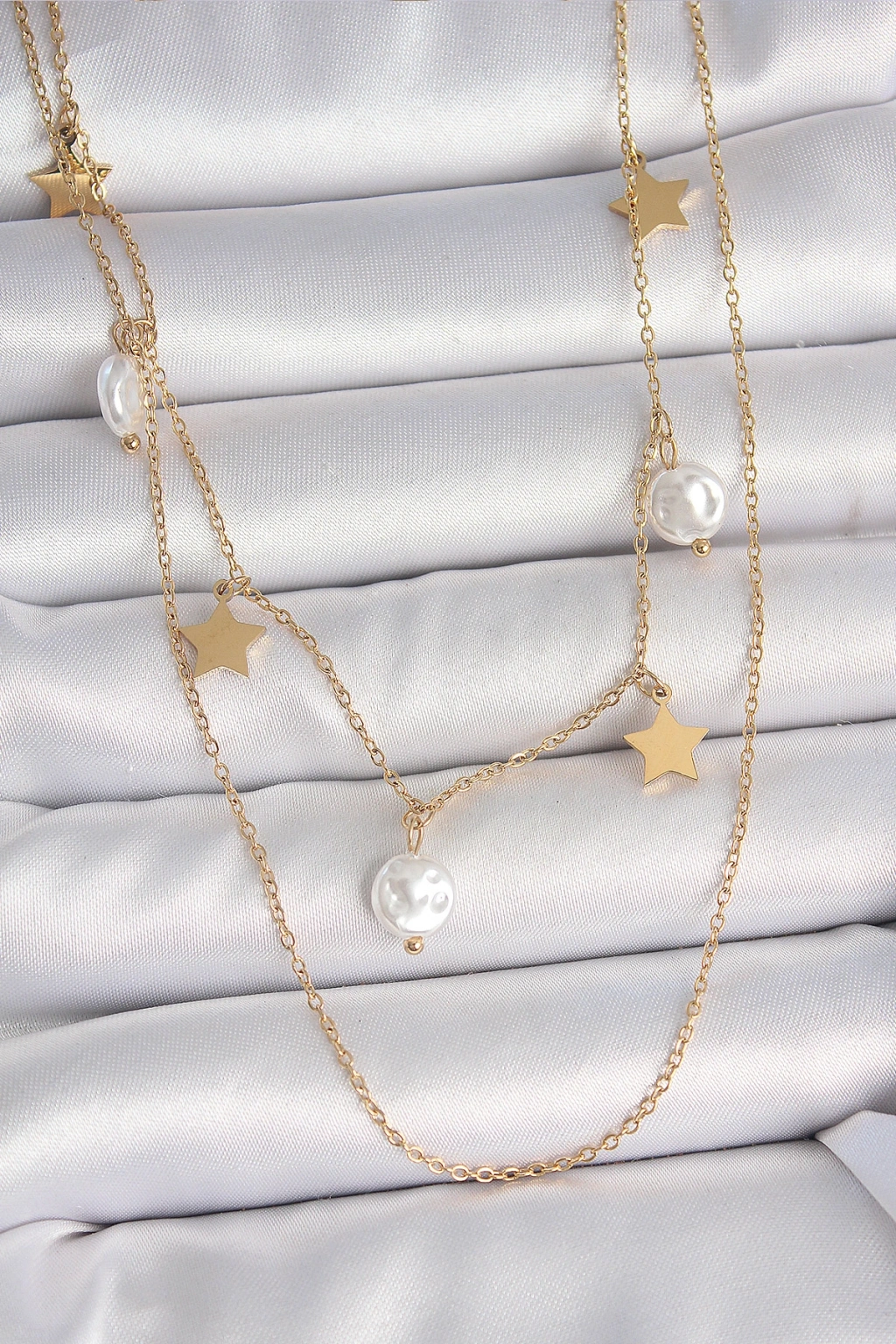 316L Çelik Gold Renk 2'Li Zincir Sallantı Yıldız İnci Model Kadın Kolye