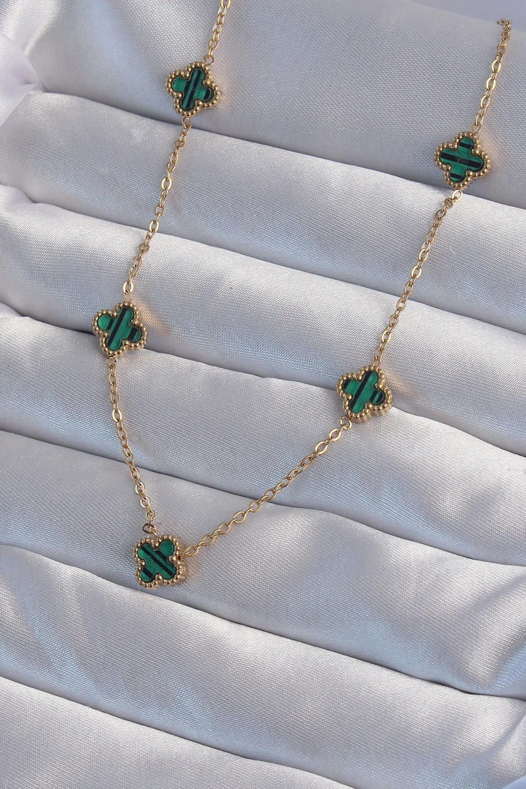 316L Çelik Gold Renk Minimal Yeşil Mineli Yonca Kolye