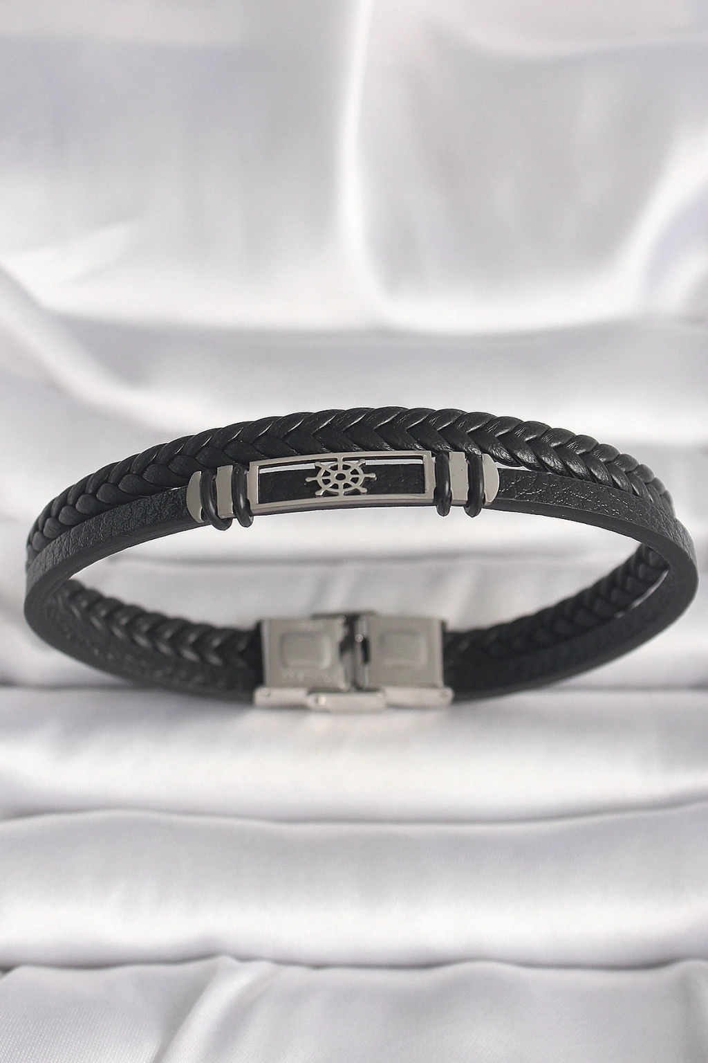 316L Çelik Gümüş Renk Gemi Dümeni Figür Siyah Burgu Deri Kordon Model Erkek Bileklik - TJ-EB3701