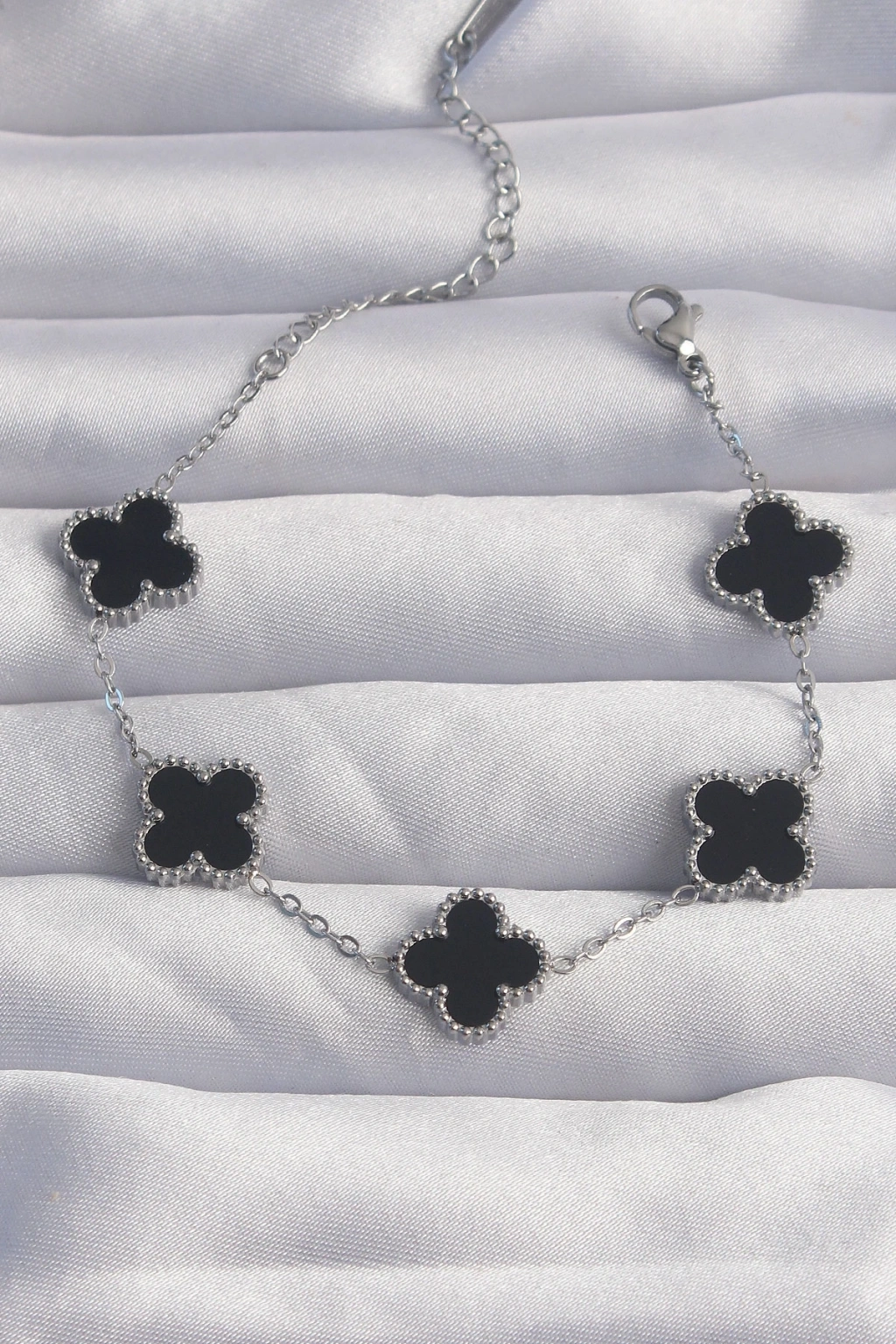 316L Çelik Gümüş Renk Siyah Mineli Yonca Bileklik