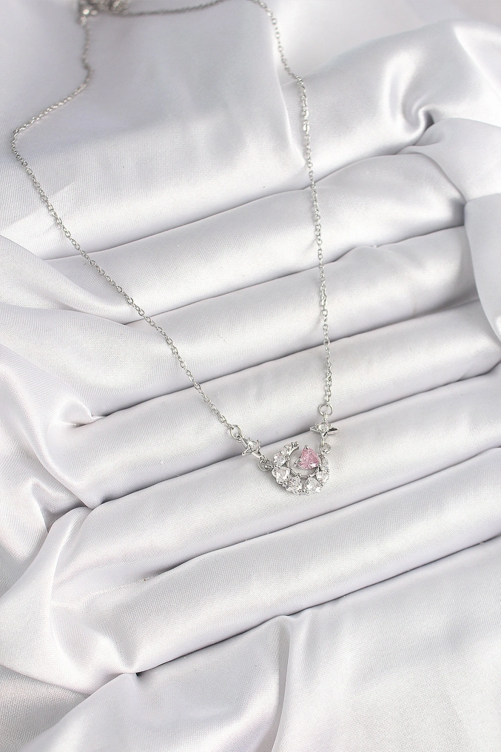 316L Çelik Gümüş Renk Zirkon Taşlı Hilal Pembe Kalp Model Kadın Kolye - TJ-BKO9930