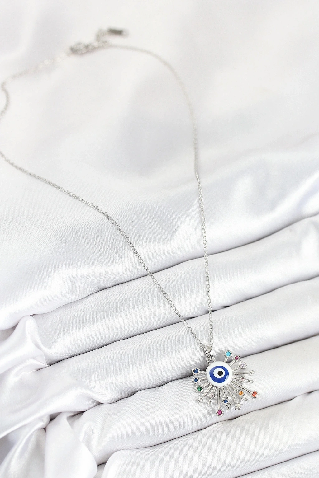 316L Çelik Zirkon Taşlı Nazar Model Gümüş Renk Kadın Kolye