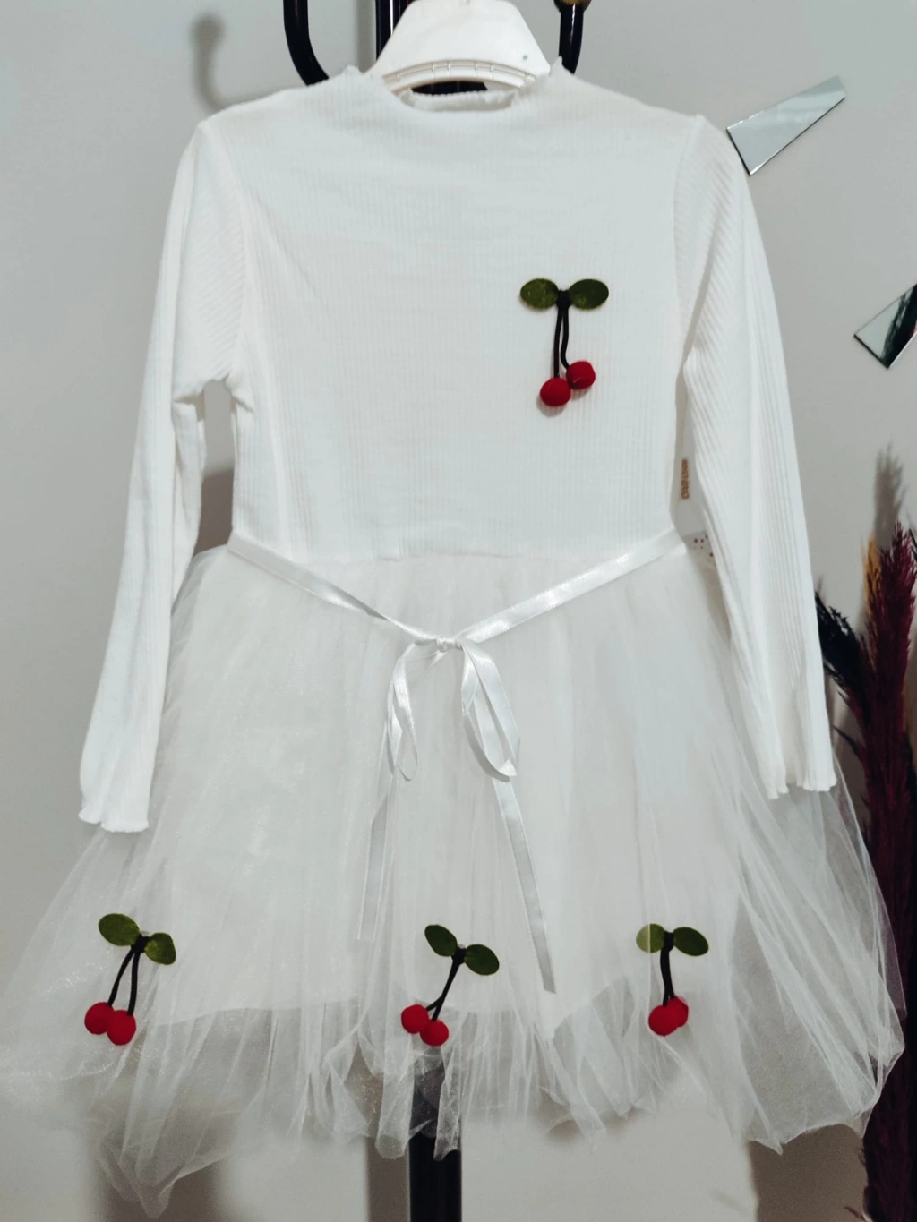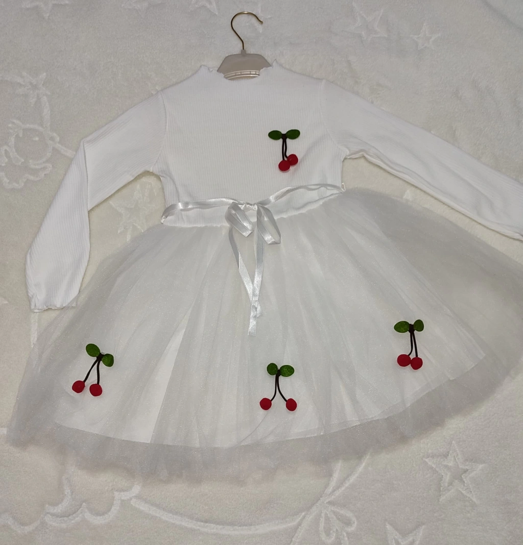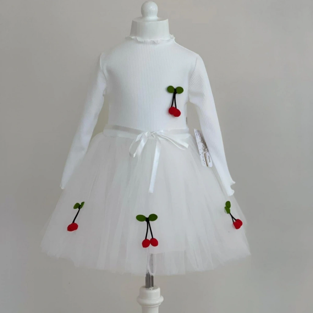 5-6-7 Yaş Kiraz Desenli Kurdela Kuşaklı Astarlı Uzun Kollu Kız Çocuk Tütü Elbise