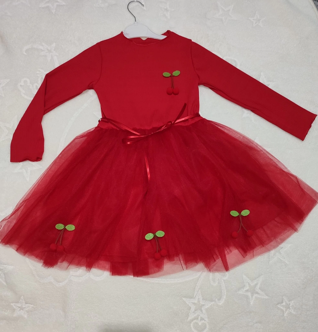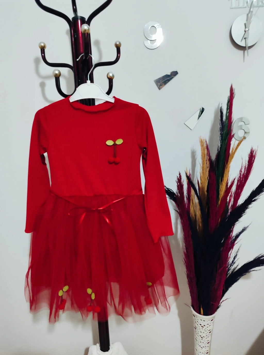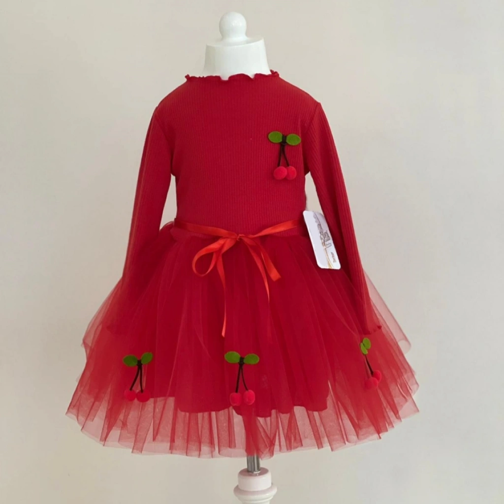 5-6-7 Yaş Kiraz Desenli Kurdela Kuşaklı Astarlı Uzun Kollu Kız Çocuk Tütü Elbise