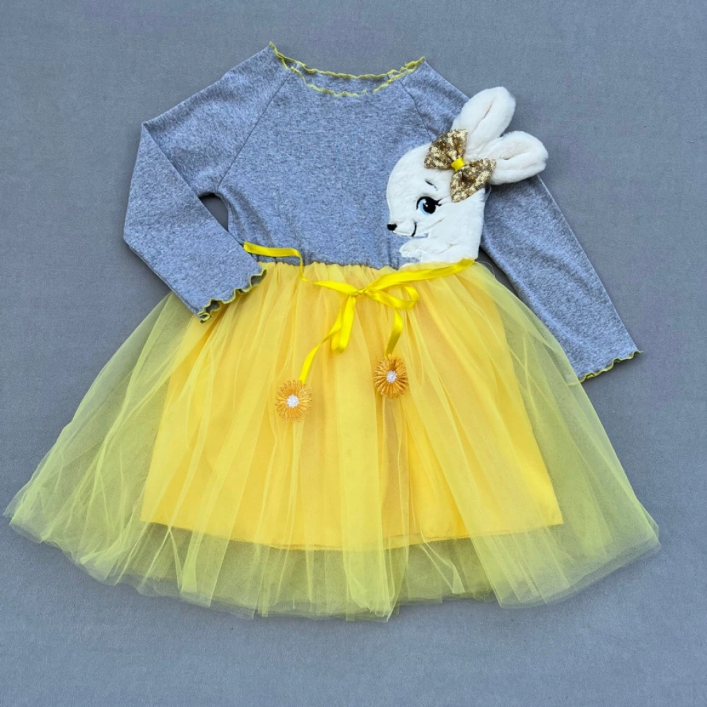 5-6-7 Yaş Pelüş Tavşan Desenli Kurdela Kuşaklı Astarlı Kız Çocuk Tütü Elbise