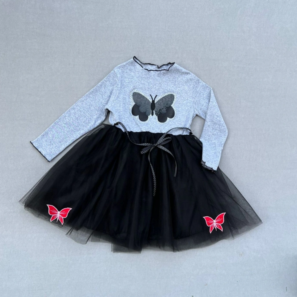 5-6-7 Yaş Taşlı Kelebek Desenli Kurdela Kuşaklı Astarlı Kız Çocuk Tütü Elbise