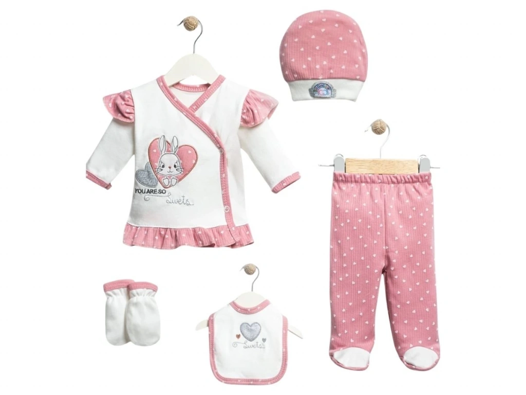 5’li Concon Fistolu Tavşan Desenli Lüks Zıbın Takımı – 1-3 Ay Kız Bebek