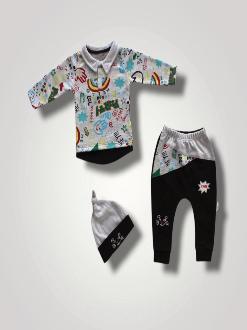 6-9 12-18 18-24 Ay Power Kedi Nakışlı Uzun Kollu Sweat Şapkalı 3lü Kız Erkek Bebek Takımı