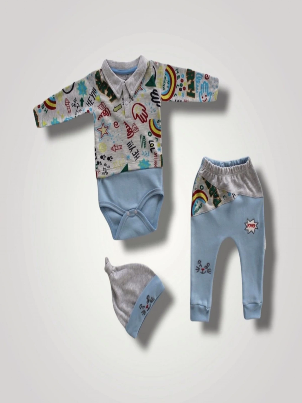6-9 12-18 18-24 Ay Power Kedi Nakışlı Uzun Kollu Zıbınlı Şapkalı 3lü Kız Erkek Bebek Takımı