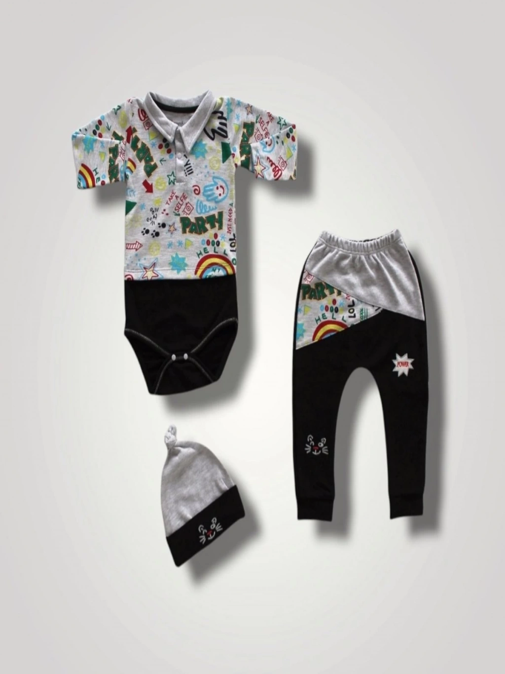 3-6 6-9 9-12 Ay Efendi Nakışlı Cep Şapkalı Uzun Kollu Sweat 3lü Erkek Bebek Takımı
