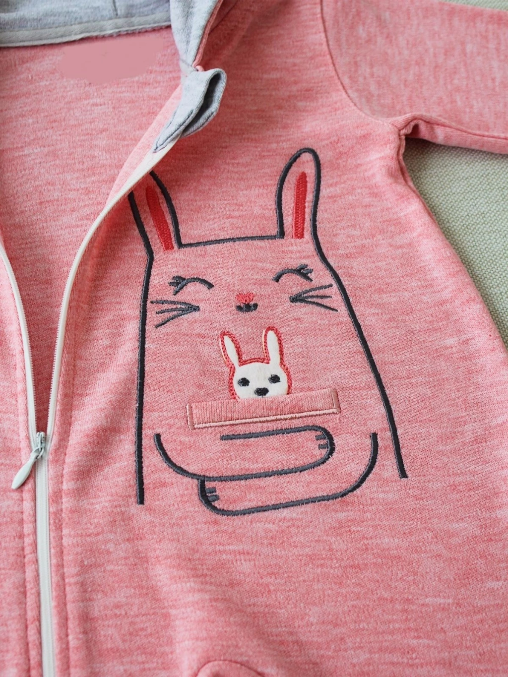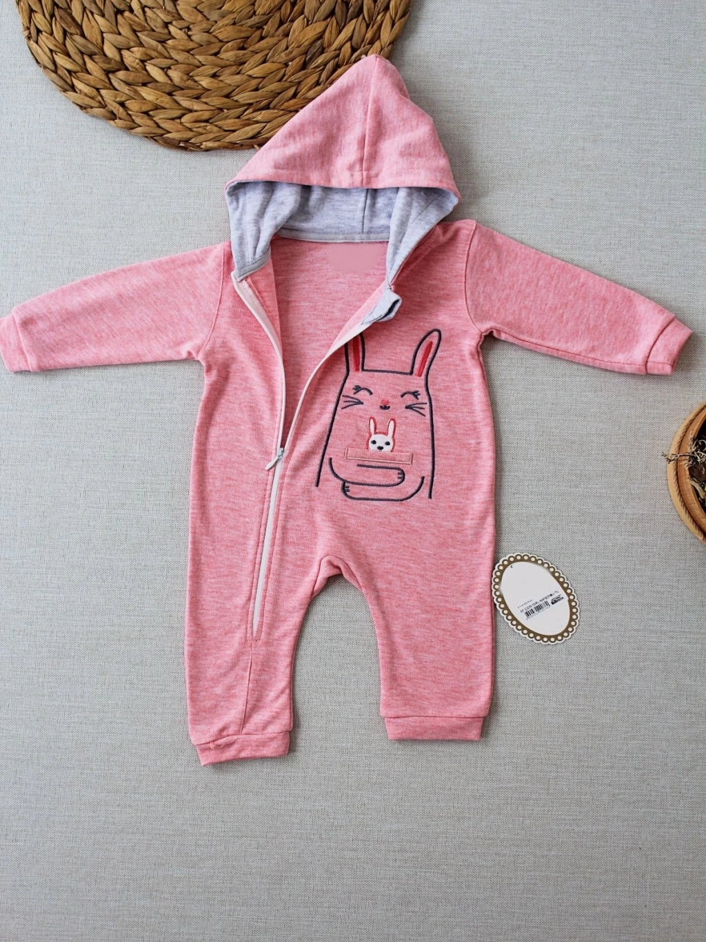6-9 9-12 Ay Ef Çizgi Boy Fermuarlı Tavşan Nakışlı Kapşonlu Kız Erkek Bebek Tulumu