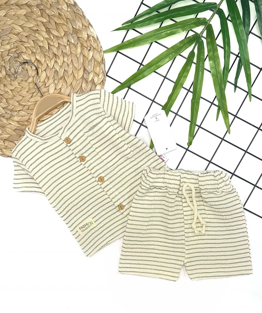 9-12-18-24 Ay Düğme Detaylı Çizgili Müslin Kumaş Yazlık 2li Erkek Bebek Takımı