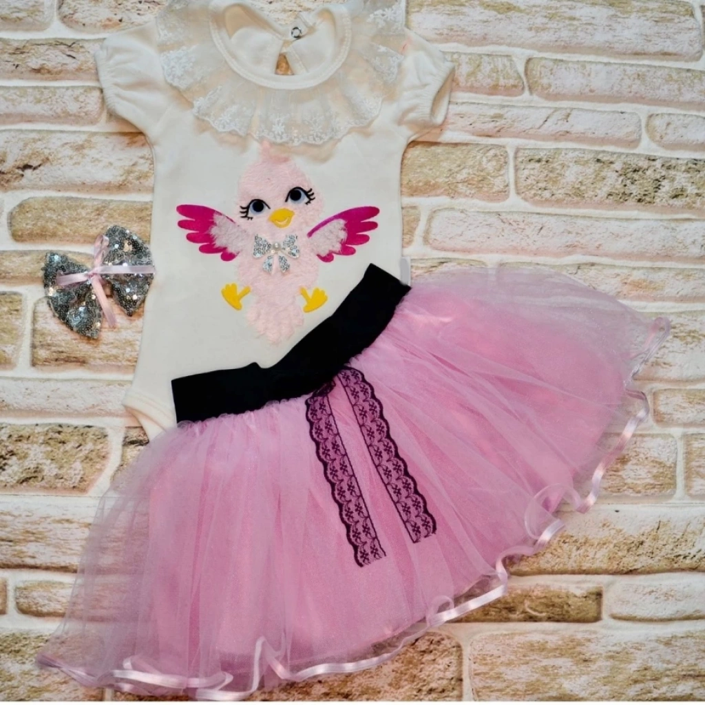 9-12-18 Ay Toka Hediyeli Kuş Desenli Tişört Tütü Etek 2li Kız Bebek Takımı