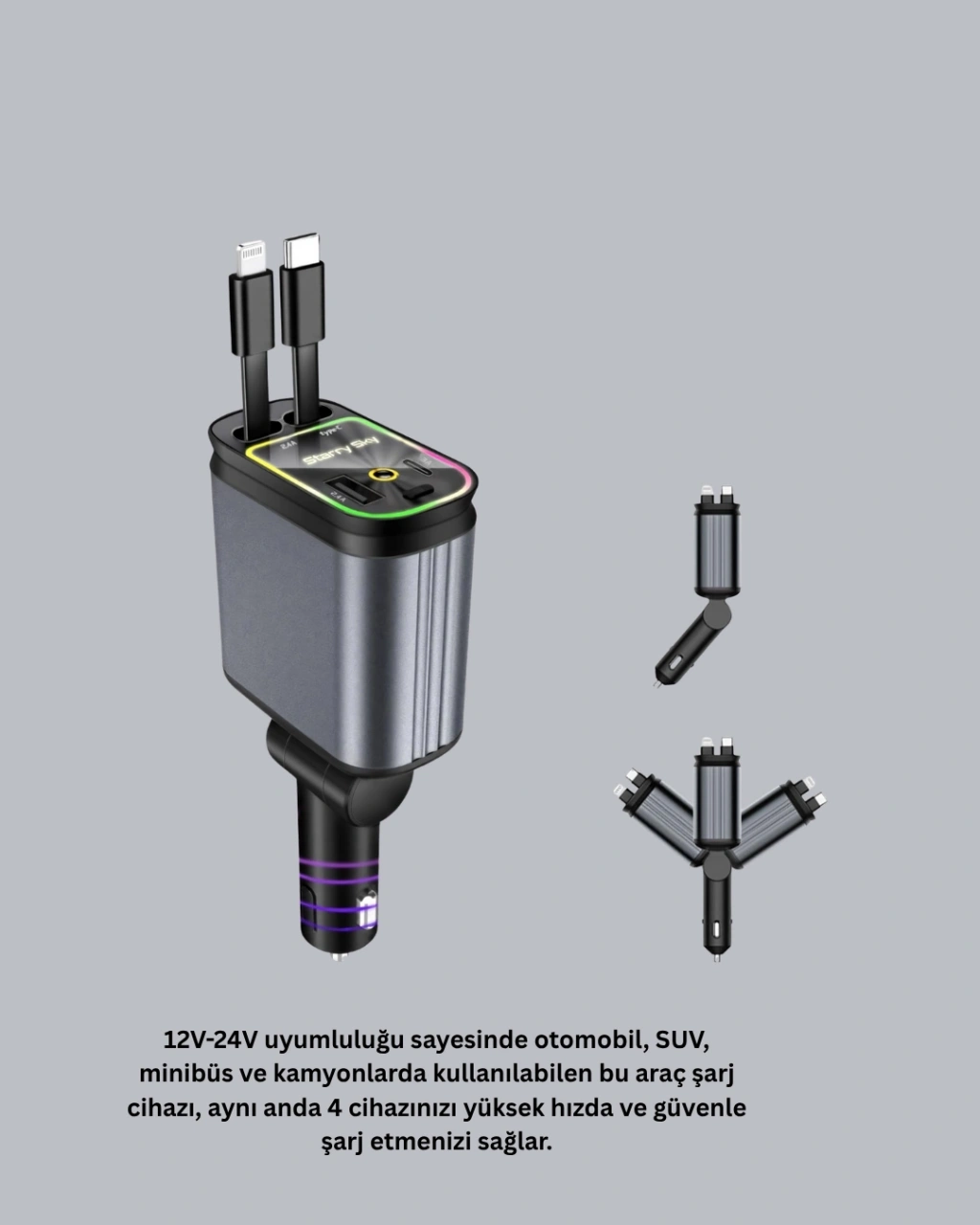 Araç Şarj Adaptörü 66W PD QC Hızlı Şarjlı ve Çekilebilir Kablolu