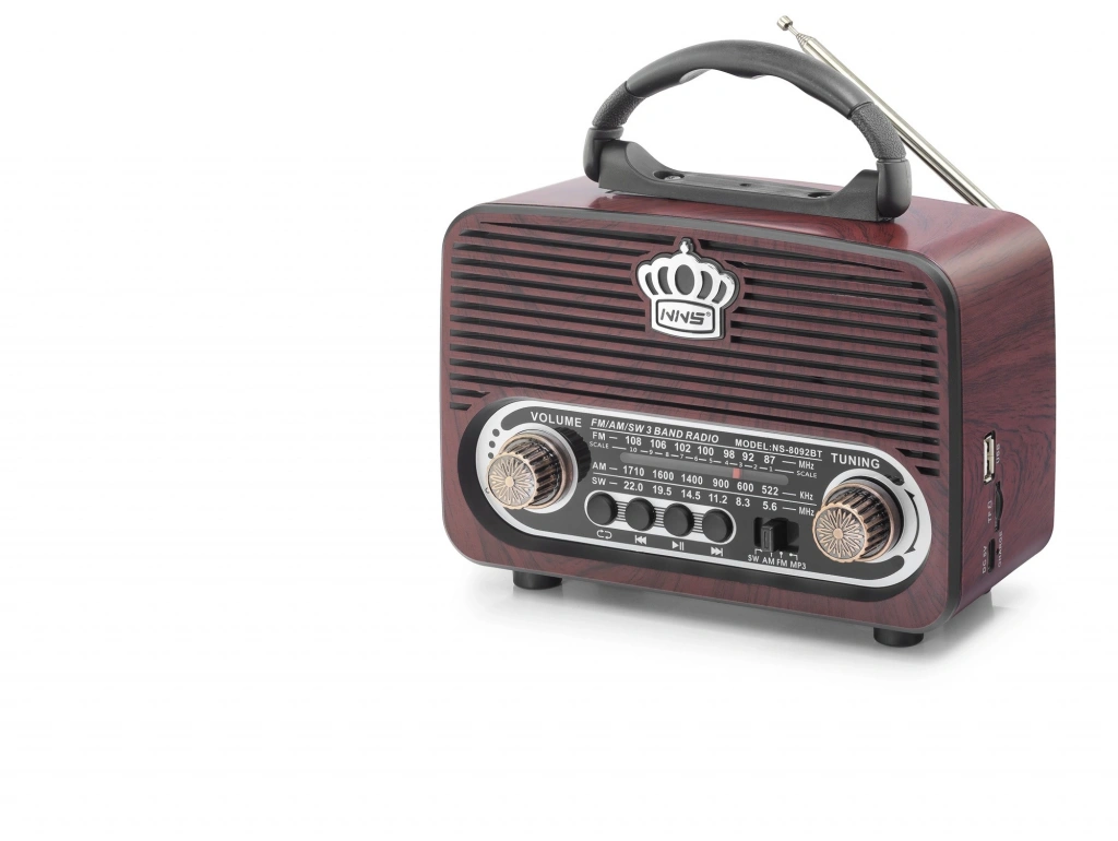 Geniş Açıklama Nns NS8092BT, Klasik Radyo Zarafetini Modern Dijital Özelliklerle Harmanlayan, 18 Cm Genişliğinde Kompakt Ve Estetik Bir Nostaljik Ses Sistemidir. Koyu Ahşap Dokulu Şık Kasası, Ön Panelindeki İkonik Kral Tacı Logosu Ve Üst Kısımdaki Ergonomik Taşıma Kulbuyla Bulunduğu Her Ortama Vintage Bir Karakter Katarken, Güncel Bluetooth 5.0 Altyapısıyla Kesintisiz Bir Müzik Akışı Sağlar.