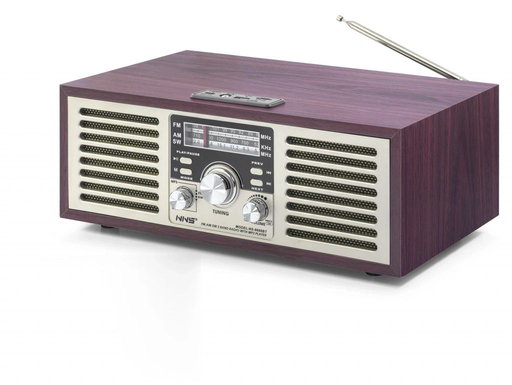Geniş Açıklama NS6686BT, Klasik Radyo Zarafetini Profesyonel Ses Kalitesiyle Buluşturan, 33 Cm Genişliğinde Üst Segment Bir Nostaljik Ses Sistemidir. Koyu Renkli Ahşap Dokusu Ve Geniş Ön Izgara Paneliyle Bulunduğu Ortama Prestijli Bir Antika Havası Katarken, Çift Sürücülü Yapısıyla Geniş Alanlarda Dahi Etkileyici Bir Stereo Performans Sergiler.