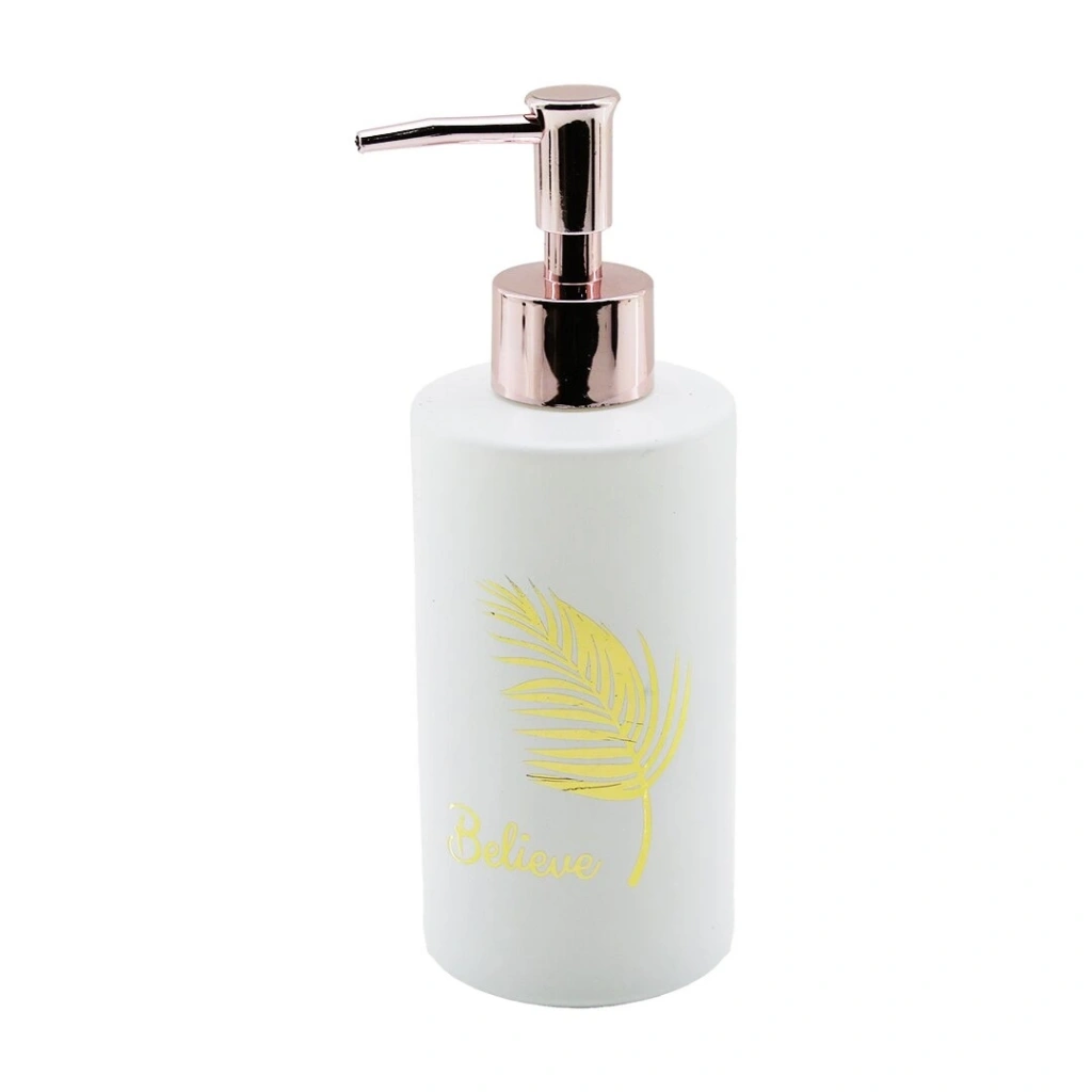 CAM YUVARLAK - BEYAZ ŞİŞE--GOLD YAPRAK DESEN SIVI SABUNLUK 350ML BRONZ PLASTİK POMPA