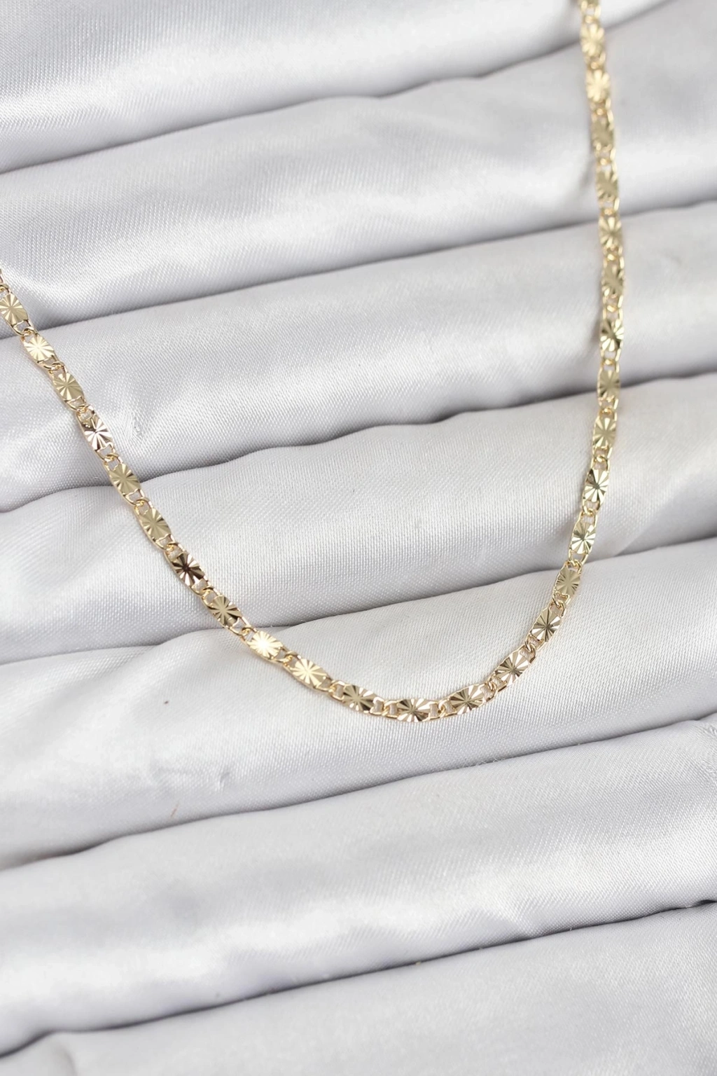 -Marka Kalitesi: CM markasının yüksek standartlı kaplama teknolojisi ile üretilmiştir.-Uzunluk: 45 cm uzunluğundadır-Materyal: Dayanıklı pirinç materyal üzerine 1. Sınıf 14K Gold (Altın) Rengi Kaplama uygulanmıştır.-Dayanıklılık: Doğru ve özenli kullanımda kararma ve renk solmasına karşı dirençlidir.-Kullanım Önerisi: Ürününüzün ışıltısını ve kaplama kalitesini uzun yıllar koruyabilmesi için parfüm, su, deterjan ve kimyasal maddelerle doğrudan temasından kaçınmanızı öneririz.-Cilt Uyarısı: Her cilt yapısının metal ve kaplamalara vereceği tepki (pH değerine bağlı olarak) farklılık gösterebilir.-Sağlıklı ve mutlu günlerde kullanmanız dileğiyle.