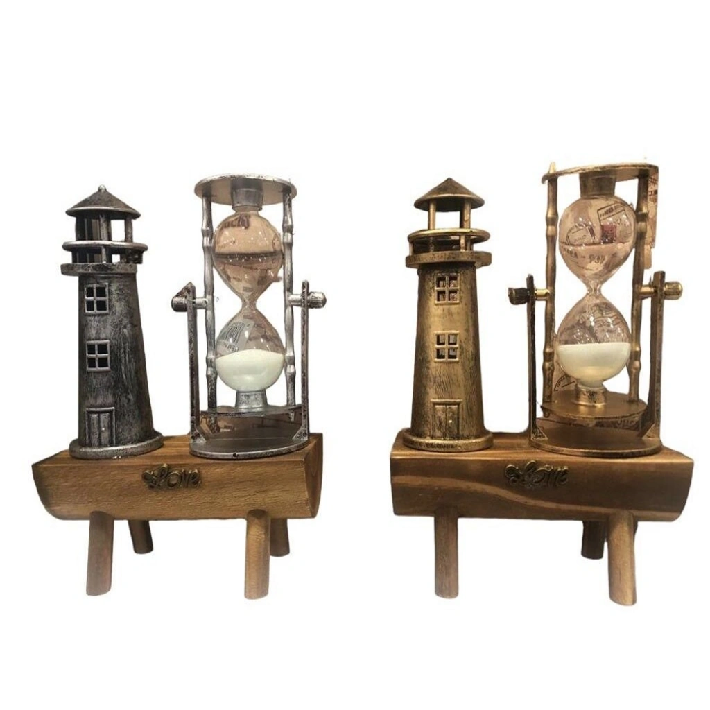 Kum saatinin yanında deniz feneri dekoru bulunmaktadır.