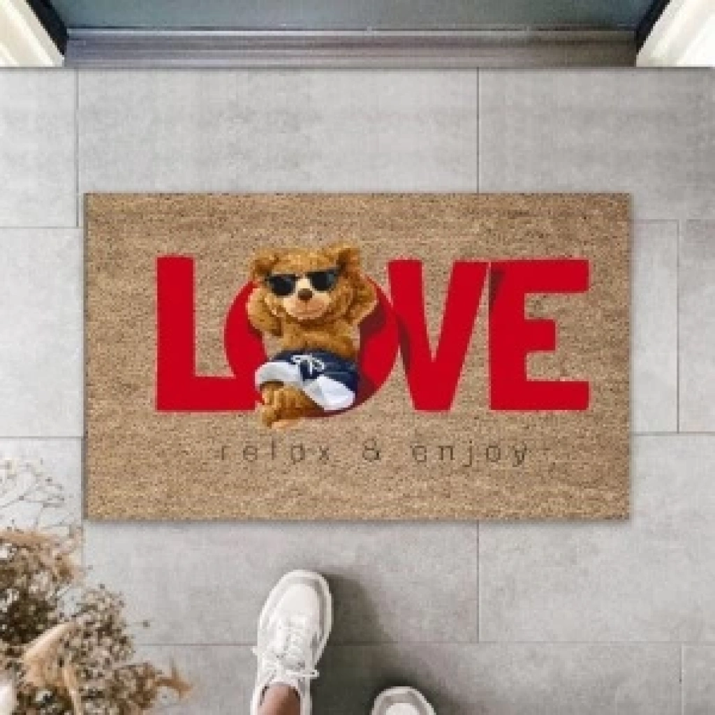 Dekoratif Dijital Love Ayıcık Bej Kapı Paspası Dış Mekan Paspas K-3178