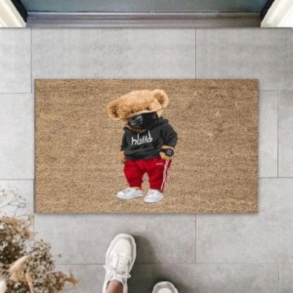 Dekoratif Dijital Maskeli Ayıcık Bej Kapı Paspası Dış Mekan Paspas K-3179