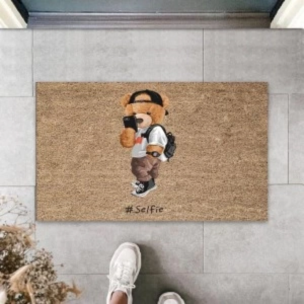 Dekoratif Dijital Selfie Çeken Ayıcık Bej Kapı Paspası Dış Mekan Paspas K-3168