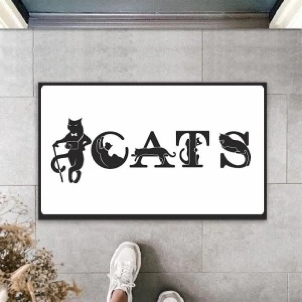 Dijital Baskı Beyaz Kedilerle Bezenmiş Cats Yazılı Dekoratif Kapı Paspası K-2028