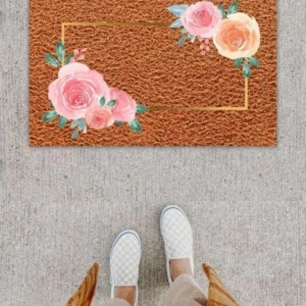 Dijital Baskı Dekoratif Çiçek Kahverengi Kapı Önü Paspası K-1237