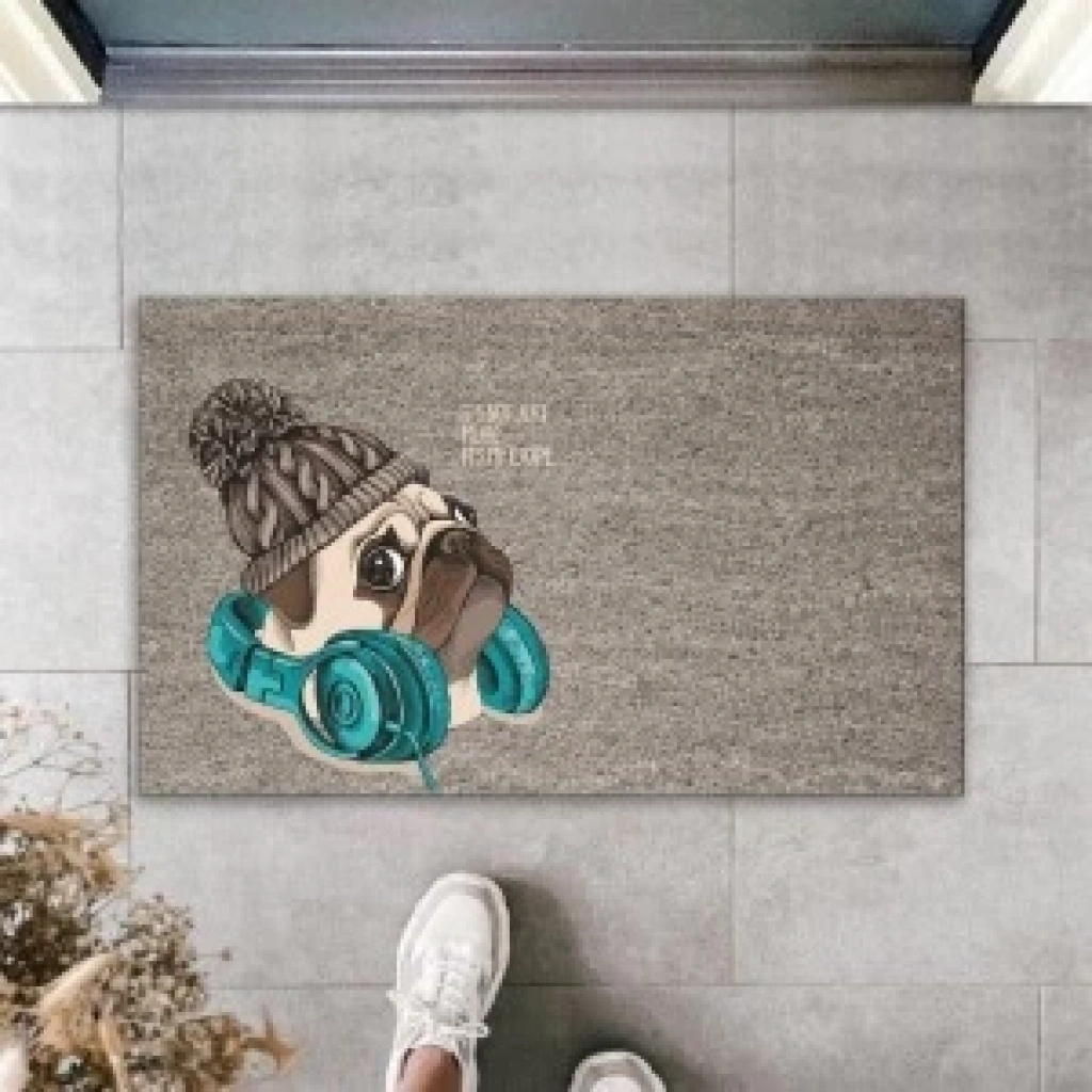Dijital Baskı Gri Bereli Kulaklıklı Köpek Dekoratif Kapı Paspası K-2022