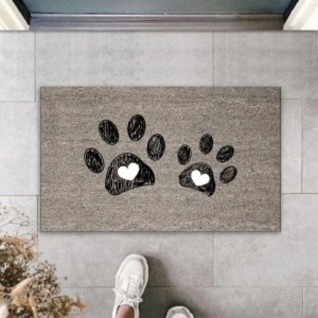 Dijital Baskı Gri Çift Kalpli Patili Dekoratif Kapı Paspası K-2031